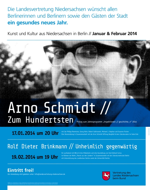 Schmidt bezeichnete unsere Wahrnehmung der Gegenwart als löchrig, und entwickelte in seiner frühen Prosa eine Erzähltechnik, die diesem Umstand gerecht werden sollte: Seine Romane setzen sich aus Verkettungen signifikanter Momentaufnahmen zusammen. Anlässlich seines einhundertsten Geburtstages am 18. Januar 2014 will die Landesvertretung dieser Intention folgen, und reiht unterschiedliche Sichtweisen in Text, Bild und Ton auf den Autor und Wahlniedersachsen aneinander, um einen gegenwärtigen Blick auf den Jubilar zu legen: