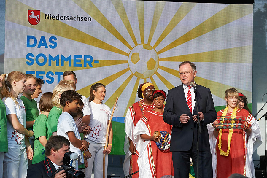 Das Sommerfest der Niedersachsen ist nicht zuletzt deshalb so beliebt, weil auf dieser Veranstaltung nach dem eher traditionellen Auftakt im Garten mit Begrüßung, Musik und dem wohl üppigsten Getränke- und Speiseangebot aller Sommerfeste in Berlin, später am Abend noch heftig getanzt wird. Auch diesmal herrschte auf der Tanzfläche im Atrium des Hauses noch bis in die ersten Stunden des nächsten Tages dichtes Gedränge. Die NDR-2-on-Tour-Band sorgte für Stimmung und Bewegung und damit auch für eine willkommene Abwechslung nach der fußballbedingten Zwischenzeit von 22 Uhr bis kurz nach Mitternacht, als das Achtelfinalspiel bei der Fußball-Weltmeisterschaft zwischen Deutschland und Algerien endlich angepfiffen wurde. Ministerpräsident Stephan Weil sprach bei der Eröffnung des Festes auch von den „drei Halbzeiten“, in die sich die Veranstaltung aufteile: „Gemeinsames Warmlaufen, zusammen Fußball gucken, gemeinsam Auslaufen.“