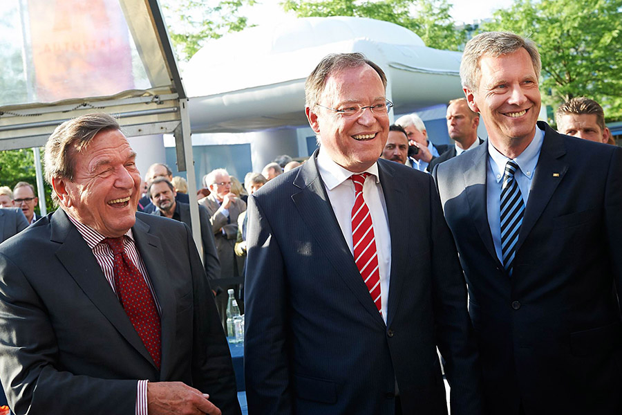 Die erste und dritte Halbzeit verliefen so kurzweilig und unterhaltsam, wie es sich die Veranstalter gewünscht hatten. Das Zwischenspiel dagegen litt zum einen unter dem dann einsetzenden starken Regen und auch unter dem zunächst wenig überzeugenden Spiel der deutschen Fußballnationalmannschaft. Erst das Ergebnis versöhnte dann wieder alle zuschauenden Hobby-Bundestrainer. Richtig vorausgesagt hatte den 2:1-Erfolg übrigens der Bevollmächtigte des Landes Niedersachsen, Staatssekretär Michael Rüter. Ehrengast Gerhard Schröder dagegen verweigerte jeden Tipp. „Ich verstehe schließlich was von Fußball“, grummelte der Altkanzler, „da tippt man nicht!“ Auch Ministerpräsident Weil ließ sich diesmal keine Prognose über den Ausgang des Fußballspiels entlocken. Dafür begrüßte Weil neben Schröder noch ein weiteres Mitglied der „niedersächsischen Nationalmannschaft“: den früheren Ministerpräsidenten des Landes und ehemaligen Bundespräsidenten Christian Wulff, der erstmals seit 2010 wieder am Sommerfest der Landesvertretung teilnahm und der die Entwicklung dieser Veranstaltung lobte.