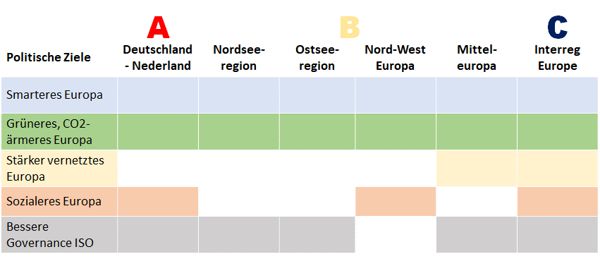Im Rahmen der durch den Europäischen Fonds für regionale Entwicklung (EFRE) vorgegebenen politischen Ziele wird es folgende Schwerpunktsetzungen in den Programmen geben: